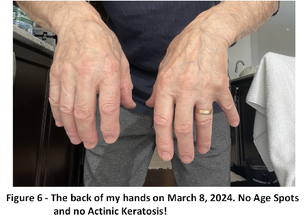 To what do I owe this amazing change? Clearly I owe it to my improved health that is resulting from my regimen that I started on March 9, 2023. This regimen is clearly responsible for getting my body biological functions working better and getting my cells healthier. This is one more proof that better orthomolecular (correct molecules) (1,2,3,23,35) nutrition does infact equip the body to take care of itself! As I was always reasonably careful with my eating, and always more active than most, I am convinced that my health improvements that have resulted in my hands spots to disappear have been contributed mostly by my vitamin supplementation, especially vitamin C. I have now been taking 10,180 mg every day since August 16, 2023.