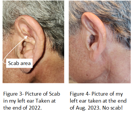 About three months ago, I noticed that I could not feel the scab in the ear anymore. So, at the first opportunity, I asked my daughter to take a picture of my ear to have a good look, and this is the picture shown in Figure 4. From this picture it is clear that the scab is gone! The skin where the scab was still looked a bit more shiny but no scab left.