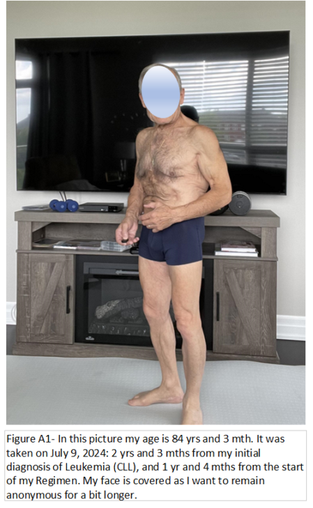 It has been one year and nine months that I started my regimen on March 9, 2023. During this time I have been enjoying a remarkable amount of stamina and wellbeing. I now regularly put in more than 9 hours each days working on computer programming, this website, or doing research in a number of interesting topics such as nutrition, biology, chemistry, and physics. The rest of the time has been going into cooking my own meals, visiting family members, and working-out as per my Exercise program. My weight has remained pretty stable while at the same time my unwanted bulges have been "melting" away. Clearly I am building some muscle, and it shows! And this is happening as I am getting within 4 months of my 85th birthday. Some time, I get the distinct impression that I am getting younger! And all of this while at the same time my Leukemia is remaining pretty stable! To put it mildly ... it is just awesome! Also there have been some very welcome health improvements as discussed below.