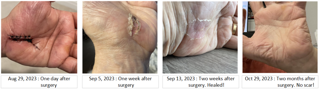 On august 2023 I underwent "Carpal Tunnell Syndrome" surgery on my left hand. The healing of the wound was so quick that everybody was amazed, including my surgeon. This is demonstrated in the pictures below that show the stitched wound right after surgery and the healing progression over the next two months. The healing was fast, and resulted in an pretty well invisible scar!