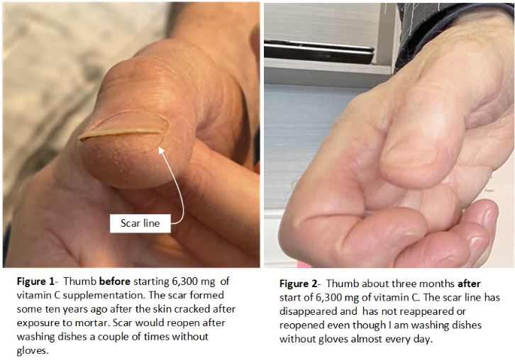 Figure 1 and 2 below show before and after pictures of my right thumb. Amazing is it not? Clearly, I have my supplements to thank for this remarkable healing which, based on my prior experiences, I attribute mostly to vitamin C. At the start, these supplements included 6,300 mg of daily vitamin C. By the time of this writing, I have increased the daily dose of vitamin C to 10,180 mg.