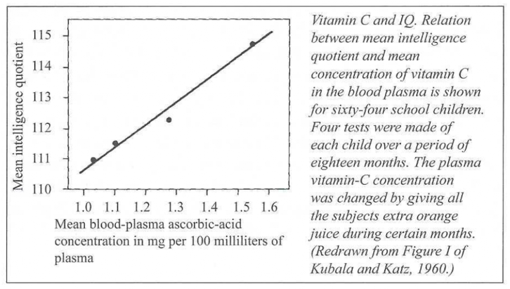 While I was digging for a possible explanation for my memory and work energy experience, I remembered the diagram below. This diagram documents the result of a study to assess the impact of vitamin C on the Intelligence Quotient of students. The study showed that the Intelligence Quotient scores of the students increased in proportion to the amount of Vitamin C that the students were taking. This diagram provides an explanation for the reason why my memory improved when I increased my vitamin C dosage. This diagram was reproduced from page 201 of Pauling's book (1). In this study, the students were taking a vitamin C amount equivalent to 180 mg for a 80 Kg adult.