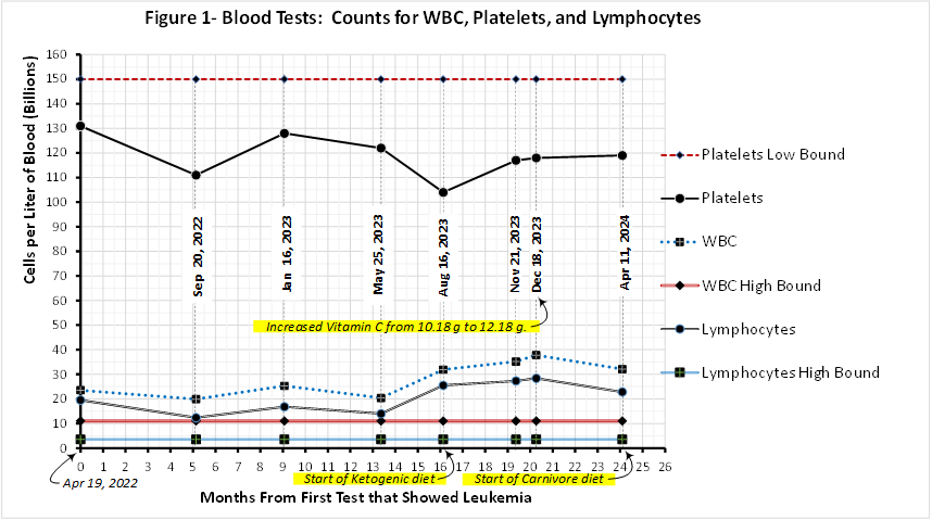 The results of my blood tests are shown in Figure 1 below. This figure shows that the counts for WBC (White Blood Cells), Platelets, and Lymphocytes are outside of the "normal range" but not excessively. It also shows is that the counts have not become significantly worse. Interestingly, because of the ketogenic diet that I have been on since August 2023, the last test (see Figure 1 below) showed that the blood counts have been trending towards better values. Could it be that the ketogenic diet is infact anti-cancer? I'll stick with it a bit longer and see if this good trend continues.